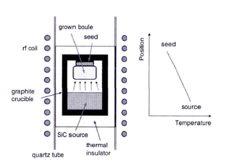 物理氣相傳輸法(PVT法),又稱為籽晶升華法、改進Lely法。SiC在常壓高溫下不熔化,但在1800℃以上的高溫時,會發生分解升華成多種氣相組分,這些氣相組分在運輸至較低溫度時又會發生反應,重新結晶生成固相SiC,PVT法正是利用了該特性。該方法于1978年首次提出,是在Lely法的基礎上進一步改進得來的,其生長裝置如下圖所示。PVT法是目前SiC單晶生長研究最多、最成熟的技術。