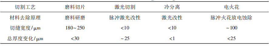 目前碳化硅切片加工技術主要包括固結、游離磨料切片、激光切割、冷分離和電火花切片,不同技術對應的性能指標如下表所示,其中往復式金剛石固結磨料多線切割是最常應用于加工碳化硅單晶的方法。