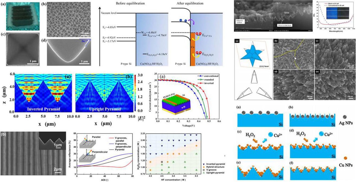 自2009年起,團隊就開展了晶硅表面絨面結構的調控技術、鈍化機理與載流子在表面界面的輸運性能等研究工作,獲得了一系列重要的原創性成果。如下圖。
