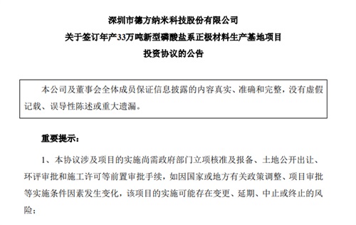 中國粉體網(wǎng)訊 1月6日,德方納米公告,公司于2022年1月4日召開的第三屆董事會(huì)第二十四次會(huì)議審議通過了《關(guān)于簽訂年產(chǎn)33萬噸新型磷酸鹽系正極材料生產(chǎn)基地項(xiàng)目投資協(xié)議的議案》,經(jīng)友好協(xié)商,公司與曲靖市人民政府、曲靖經(jīng)濟(jì)技術(shù)開發(fā)區(qū)管理委員會(huì)簽訂了《年產(chǎn)33萬噸新型磷酸鹽系正極材料生產(chǎn)基地項(xiàng)目投資協(xié)議》,公司擬在曲靖經(jīng)濟(jì)技術(shù)開發(fā)區(qū)建設(shè)“年產(chǎn)33萬噸新型磷酸鹽系正極材料生產(chǎn)基地項(xiàng)目”,項(xiàng)目總投資約人民幣75億元。