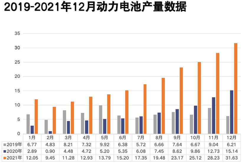 2021年1-12月,我國動力電池產(chǎn)量累計219.7GWh,同比累計增長163.4%。其中,三元電池產(chǎn)量累計93.9GWh,占總產(chǎn)量42.7%,同比累計增長93.6%;磷酸鐵鋰電池產(chǎn)量累計125.4GWh,占總產(chǎn)量57.1%,同比累計增長262.9%。12月份我國動力電池的裝車量為26.2GWh,同比增長102.4%,環(huán)比增長25.9%。其中三元電池共計裝車11.1GWh,同比增長84.7%,環(huán)比增長19.7%;磷酸鐵鋰電池共計裝車15.1GWh,同比增長118.5%,環(huán)比增長30.1%。根據(jù)統(tǒng)計,去年前12月,我國動力電池裝車量累計154.5GWh,同比累計增長142.8%。其中三元電池裝車量累計74.3GWh,占總裝車量48.1%,同比累計增長91.3%;磷酸鐵鋰電池裝車量累計79.8GWh,占總裝車量51.7%,同比累計增長227.4%。