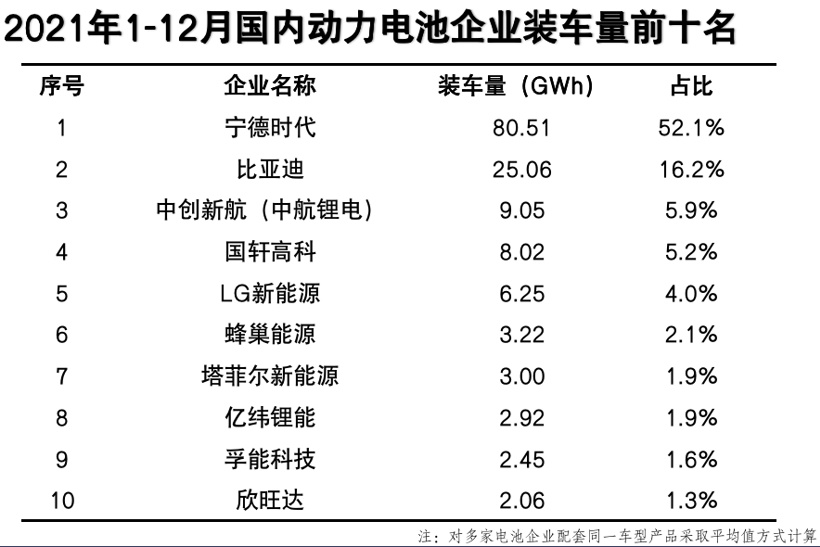 去年全年我國新能源汽車市場共計58家動力電池企業(yè)實現(xiàn)裝車配套,較去年同期減少13家,排名前3家、前5家、前10家動力電池企業(yè)動力電池裝車量分別為114.6GWh、128.9GWh和142.5GWh,占總裝車量比分別為74.2%、83.4%和92.3%。2021年12月,我國新能源汽車按車型劃分的單車平均裝車電量48.8kWh,同比下降8.6%。其中純電動乘用車和純電動客車單車平均帶電量分別為48.6kWh/輛和197.7kWh/輛,同比分別增長6.8%和下降10.4%。而2021年12月,我國純電動乘用車系統(tǒng)能量密度在140(含)-160Wh/kg和160Wh/kg及以上車型產(chǎn)量占比相當(dāng),分別為29.6%和30.2%。125(含)-140Wh/kg車型產(chǎn)量占比由11月18.7%上升至22.8%,125Wh/kg以下車型占比17.4%,較11月保持穩(wěn)定。