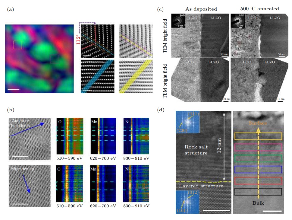 科研工作者的研究發(fā)現(xiàn),在LCO/LLZO和LNMO/LLZO體系中都存在由于固-固界面點(diǎn)接觸造成的正極側(cè)結(jié)構(gòu)的巨大改變,進(jìn)而改變了物質(zhì)傳輸通道。其中在LCO正極材料中發(fā)現(xiàn)在應(yīng)力和界面有限位置的鋰離子傳輸通道的情況下,單晶LCO通過形成由孿晶界和反相界面相連的納米多晶結(jié)構(gòu),改變了鋰離子在電極側(cè)的傳輸路徑,如圖1(a)。在LNMO正極材料中由于固-固界面不均勻接觸導(dǎo)致的電極材料脫鋰不均勻現(xiàn)象,進(jìn)而造成局域過渡金屬遷移堵塞鋰離子傳輸通道,如圖1(b)所示。