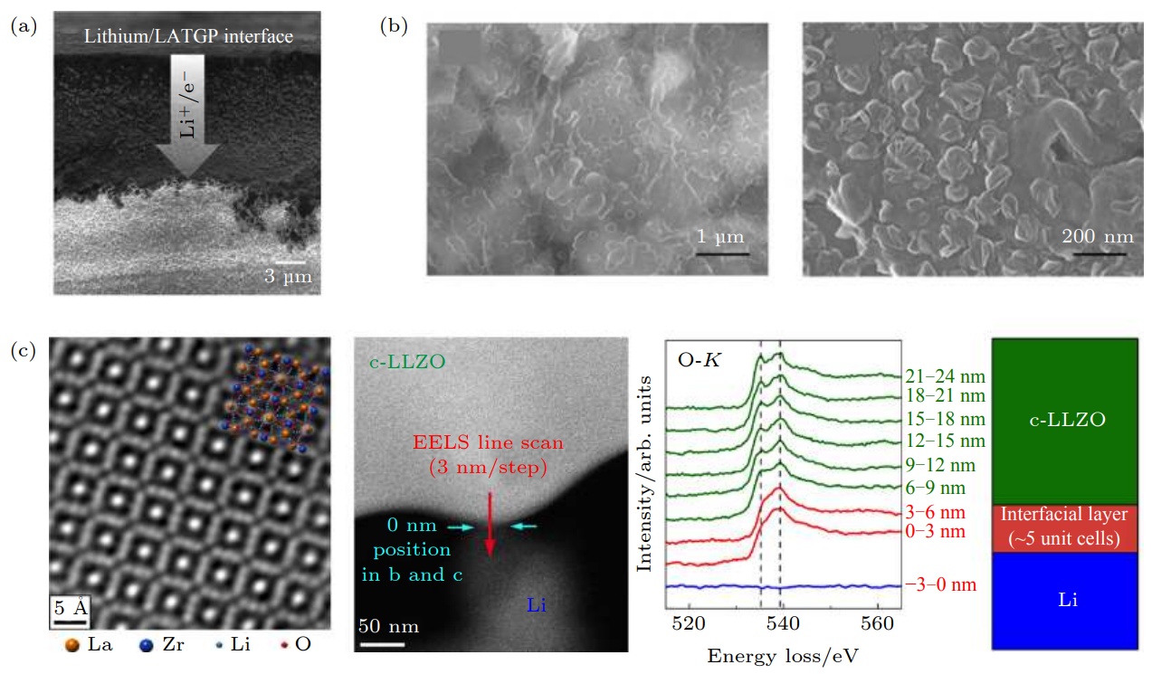 圖3 化學(xué)接觸界面的結(jié)構(gòu)和物質(zhì)輸運(yùn)(a)Li/LAGP界面發(fā)生反應(yīng);(b)Li/LZPO界面反應(yīng);(c)Li/LLZO界面反應(yīng)(來源:拱越等.全固態(tài)電池中界面的結(jié)構(gòu)演化和物質(zhì)輸運(yùn))