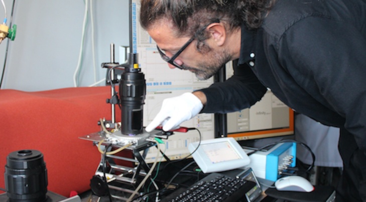 由Dino Klotz博士操作的實(shí)驗(yàn)裝置表明,光可以根據(jù)帶電原子或離子的運(yùn)動來提高燃料電池,鋰電池和其他設(shè)備的性能。(來源:麻省理工學(xué)院)