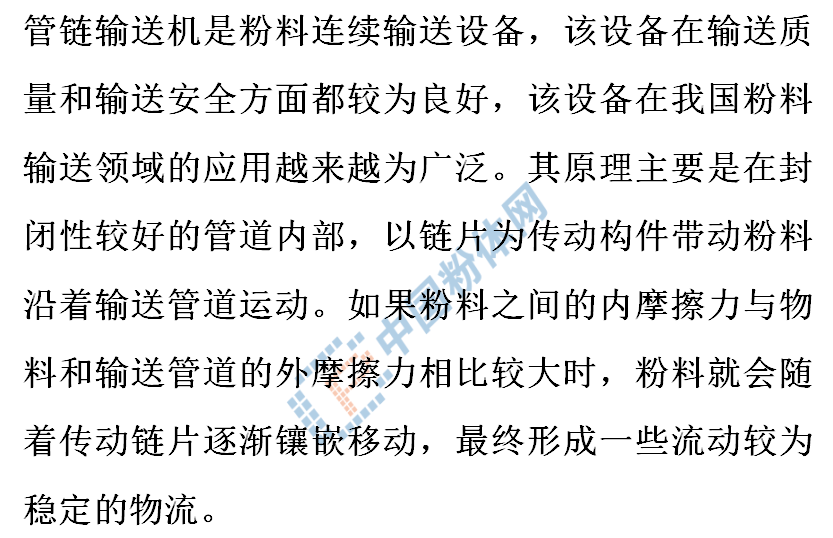 (2)近年來,管鏈輸送機在PTA等行業應用比較成熟,目前在類似的流量小、流動性好的粉粒體輸送中應用較多。管鏈輸送機內部設置有鏈條、輸送盤及轉角鏈輪等機構,近年來涌現出不少針對輸送盤、鏈條、張緊裝置等的研究成果,解決了管鏈輸送機制造和使用中的部分問題,有利于管鏈輸送機的推廣使用。