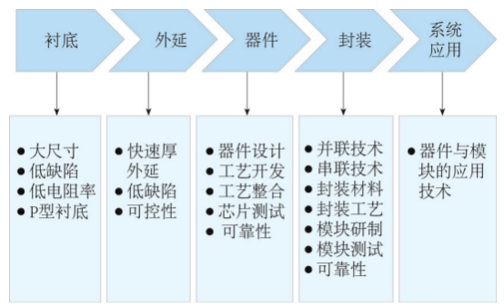 碳化硅器件性能非常突出,但其生產過程可謂是困難重重。其產業鏈貫穿了材料、芯片設計、制造工藝等各個環節。相對傳統硅基技術而言,寬禁帶功率器件由于采用了SiC半導體材料,在各關鍵技術環節也會遇到新的問題與挑戰。