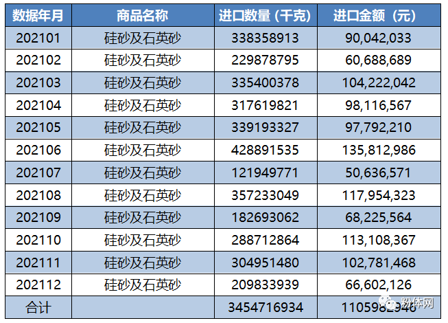 2021年我國石英砂(HS:25051000硅砂及石英砂)進口統計