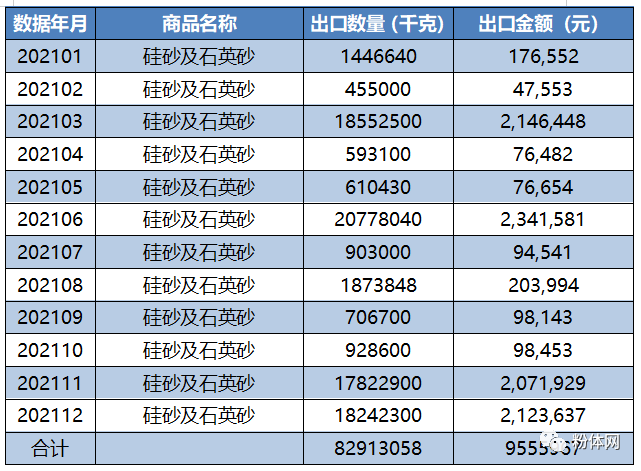 2021年我國石英砂(HS:25051000硅砂及石英砂)出口統計