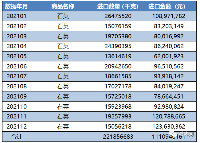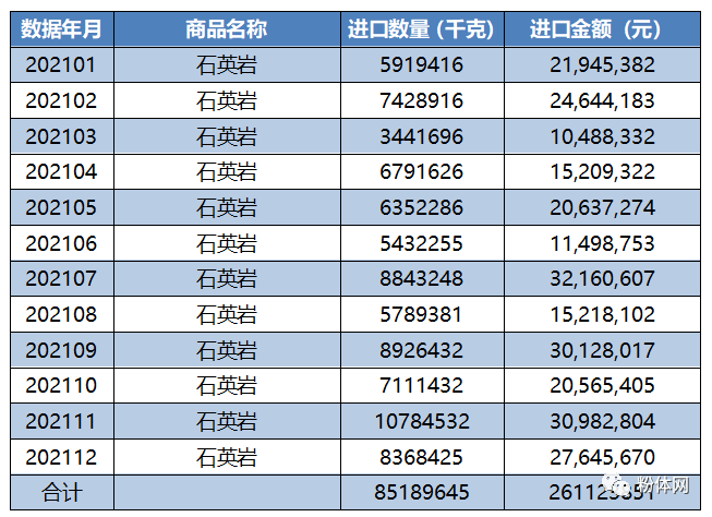 此外,2021年,石英、石英巖的進口數量分別為22.18萬噸、8.51萬噸,進口均價分別為5007.49元/噸、3065.20元/噸。
