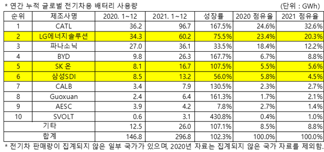 中國粉體網訊 2月7日消息,韓國市場研究機構SNE Research發布2021年全球動力電池裝機量排行榜。