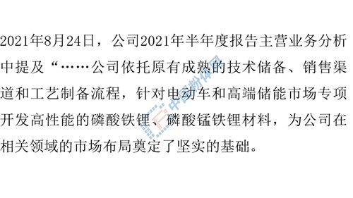 2021年8月28日,公司于2021年半年度報告中提及新產品研發進展:新型磷酸鹽系正極材料對比磷酸鐵鋰具有更高的電壓平臺,顯著提升電池的能量密度,且保留了磷酸鐵鋰電芯的安全性及低成本特性。補鋰添加劑材料和新型磷酸鹽系正極材料復合使用后,對比現有磷酸鐵鋰電池能量密度提升約20%。目前兩款材料均已通過下游客戶的小批量驗證,進入產業化階段。