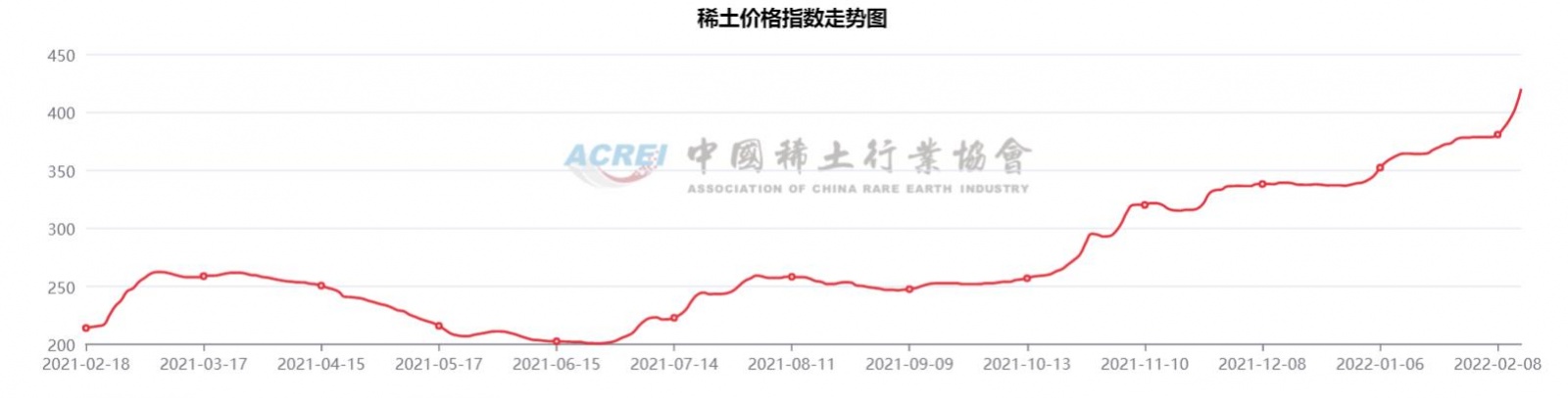 中國粉體網訊  據中國稀土行業協會,02月14日稀土價格指數為420.6,較上周五漲17.1點,續創歷史新高。