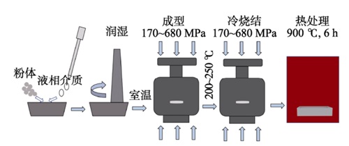 1986年,Yamasaki團隊首次提出了等靜壓與水熱法相結合的陶瓷燒結法,此方法能將燒結溫度降到200℃以下,并將其稱之為水熱熱壓法(Hy-drothermal hot pressing,HHP)。2016年,賓夕法尼亞州立大學的Randall課題組在水熱熱壓燒結的基礎上提出了一種新的低溫燒結方式,并命名“Cold Sintering Process”(CSP,冷燒結過程)。Randall等人首次采用冷燒結工藝,在低溫條件下制備了KH2PO4,NaNO2,Ba-TiO3三種鐵電材料,并在此基礎上進一步探究了燒結工藝參數對于材料性能的影響,為陶瓷低溫燒結工藝提供了新思路。