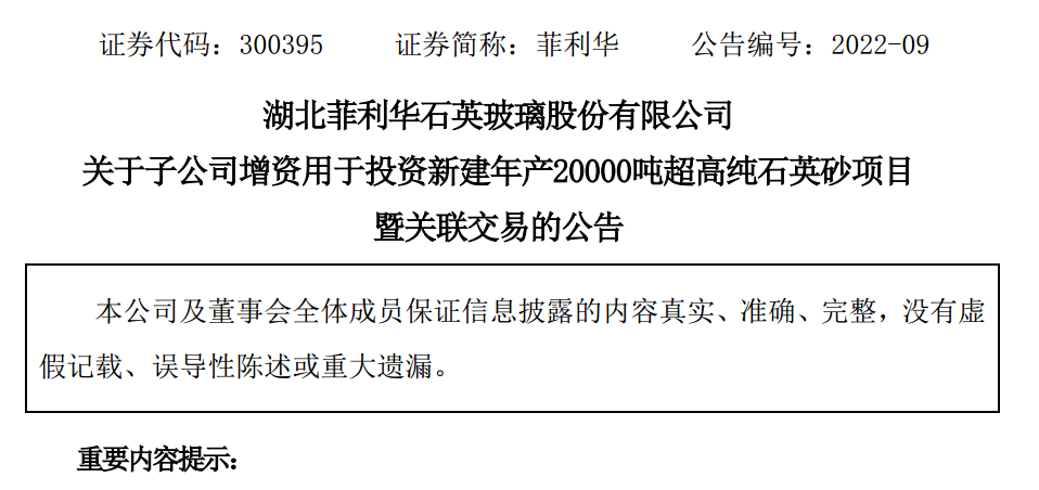 公告稱,根據公司發展戰略及未來規劃,為實現公司業務健康快速發展,融鑒科技擬進行增資擴股,用于投資新建“年產20000噸超高純石英砂項目”,擴大高純石英砂生產規模,提升公司供應鏈的保障力度,滿足市場對高純石英砂的需求。本項目投資總額為3億元,項目分兩期建設,首期建設規模年產10,000噸,投資金額為1億元。