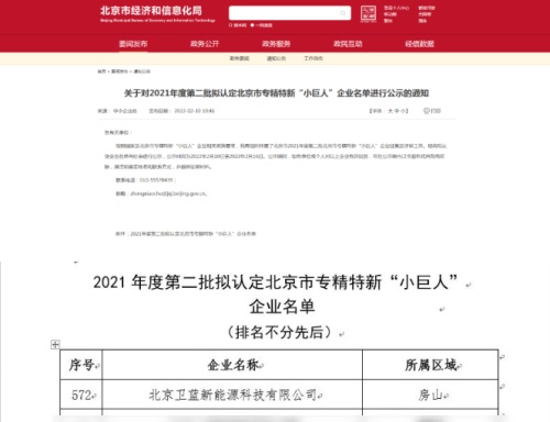 中國粉體網訊 近日,北京市經濟和信息化局公布了北京市2021年度第二批專精特新“小巨人”企業名單,北京衛藍新能源科技有限公司(以下簡稱“衛藍新能源“)憑借在固態電池領域的技術先進性和持續的創新能力,成為北京市專精特新“小巨人”企業。