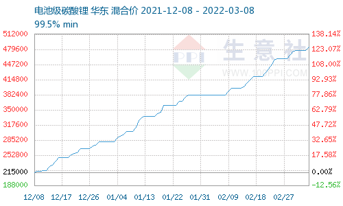 3月初工業級碳酸鋰華東地區均價價格為456600元/噸,與2月底相比,價格上調了3.4%。電池級碳酸鋰華東地區均價價格為478000元/噸,與2月底相比,價格上調了3.91%。