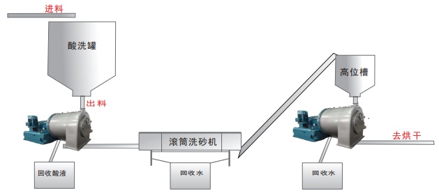 酸洗罐內酸洗合格的石英砂和酸液一同進入離心 脫酸機,在高速離心力的作用下,酸液和石英砂分 離,酸液回收使用,而脫酸至5 - 8 %的石英砂經滾筒 洗砂機初步水洗后送入高位槽(砂:水= 1 : 1),從 高 位 槽 底 部 出 來 的 石 英 砂 和 水 一 同 進 入 離 心 脫 水 機,在離心力的作用下,石英砂脫水至5 - 8 %,即可送入烘干機進行烘干處理