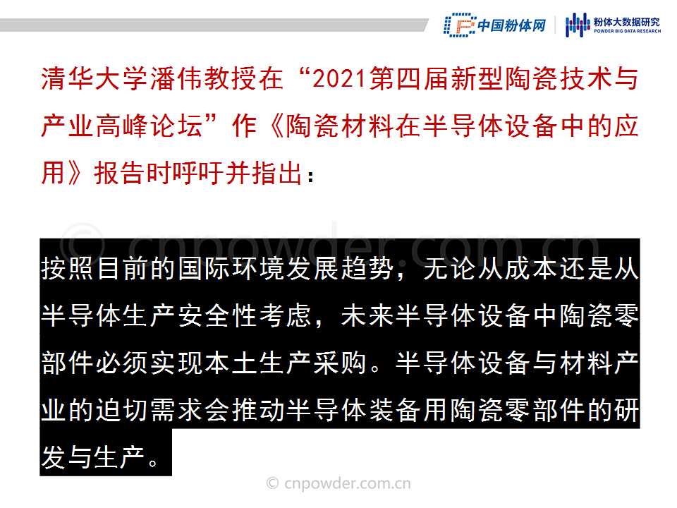 【編者前言】按照目前的國際環(huán)境發(fā)展趨勢,無論從成本還是從半導(dǎo)體生產(chǎn)安全性考慮,未來半導(dǎo)體設(shè)備中陶瓷零部件必須實現(xiàn)本土生產(chǎn)采購。半導(dǎo)體設(shè)備與材料產(chǎn)業(yè)的迫切需求會推動半導(dǎo)體裝備用陶瓷零部件的研發(fā)與生產(chǎn)。
