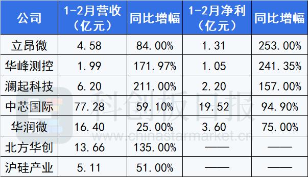 中國粉體網訊 近日,半導體行業多家公司加入“二月報”自愿披露行列,囊括材料、設備、設計、代工多個環節。據《科創板日報》統計,A股目前已有7家半導體公司披露1至2月業績,其中5家公司實現營收、凈利同比雙增,立昂微、華峰測控、瀾起科技的凈利同比增速超一倍。