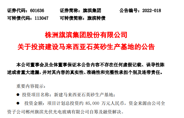 中國粉體網訊 3月17日,株洲旗濱集團股份有限公司(以下簡稱“旗濱集團”)發布公告稱,為保障海外光伏玻璃生產線的用砂需求和供應安全,延伸和打造一體化產業鏈,公司決定同步在馬來西亞沙巴州投資建設石英砂生產基地。