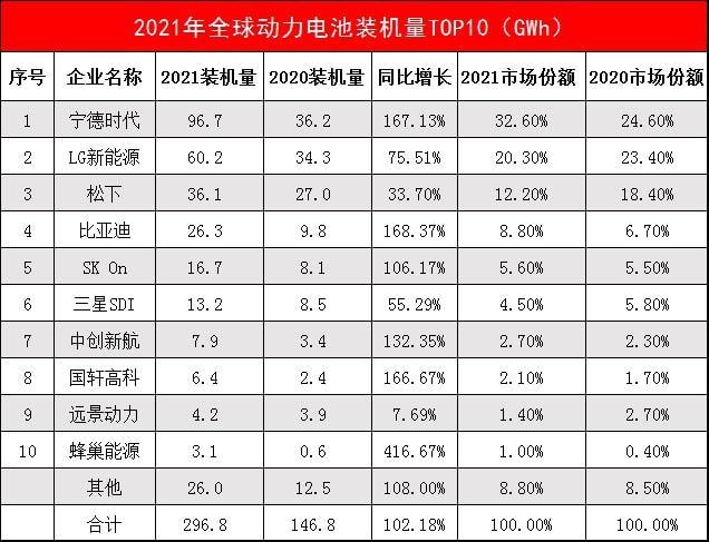 中國粉體網訊 2月份,韓國市場研究機構SNE Research發布了2021年全球動力電池裝機量排行榜。根據SNE的統計,全球動力電池裝機量排行榜前十名企業分別為:寧德時代、LG新能源、松下、比亞迪、SK On、三星SDI、中創新航(中航鋰電)、國軒高科、遠景動力、蜂巢能源。