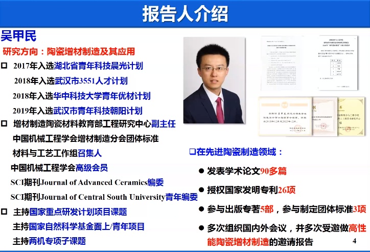 4來自華中科技大學(xué)的吳甲民副教授為大家?guī)眍}目為《陶瓷增材制造及其應(yīng)用研究進展》的報告。