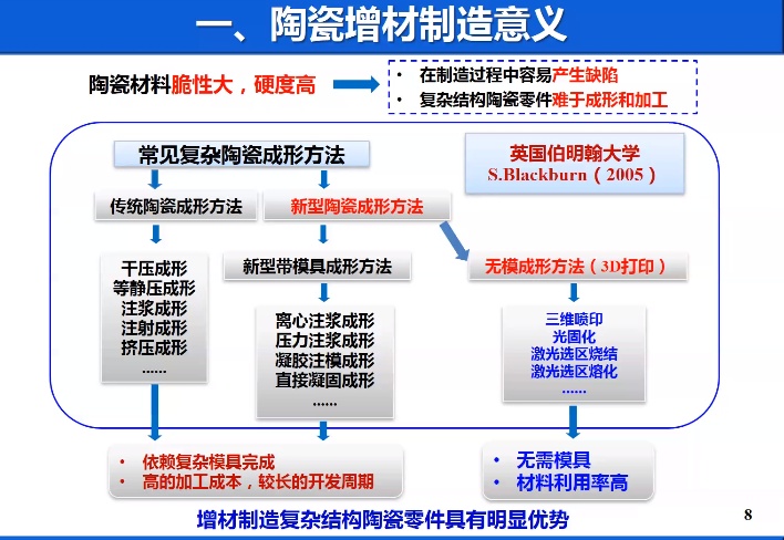 接下來,吳老師介紹了陶瓷增材制造的意義,并分析了陶瓷增材制造的特點和其常見的成型方法。