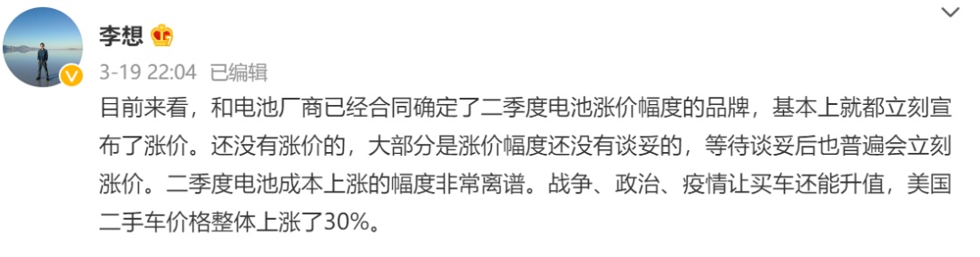 此前,理想汽車CEO李想在社交平臺上表示,目前來看,和電池廠商已經合同確定了二季度電池漲價幅度的品牌,基本上就都立刻宣布了漲價。還沒有漲價的,大部分是漲價幅度還沒有談妥的,等待談妥后也普遍會立刻漲價。二季度電池成本上漲的幅度非常離譜。戰爭、政治、疫情讓買車還能升值,美國二手車價格整體上漲了30%。