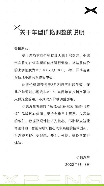 小鵬汽車發布公告稱,受上游原材料價格持續大幅上漲影響,小鵬汽車對在售車型的價格進行調整,補貼前售價上調1.01-2.0萬元不等,此次調價將于3月21日0時起正式生效,在此之前通過官方渠道支付定金的用戶不受此次價格調整影響。