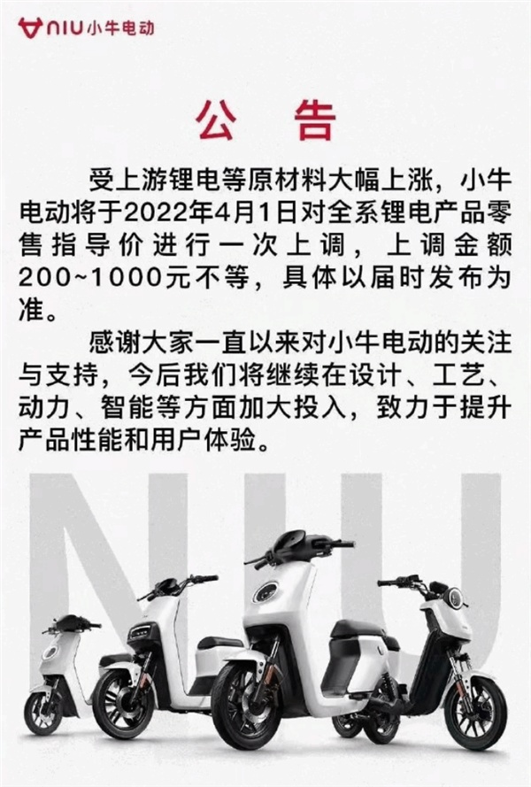 3月21日,小牛電動發布公告稱,受上游鋰電等原材料(價格)大幅上漲,小牛電動將于2022年4月1日對全系鋰電產品零售指導價進行一次上調,上調金額200-1000元不等,具體以屆時發布為準。