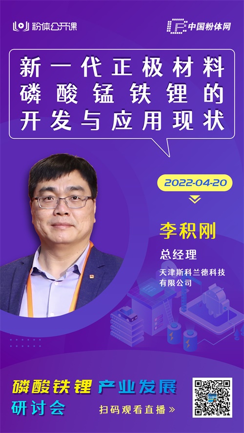 隨著產品和技術的不斷成熟,磷酸錳鐵鋰產業有望獲得快速發展。為了解行業最新動態,中國粉體網旗下粉體公開課平臺將于4月20日線上舉辦“磷酸鐵鋰產業發展研討會”,屆時將邀請來自天津斯科蘭德科技有限公司的李積剛總經理作《新一代正極材料磷酸錳鐵鋰的開發與應用現狀》報告。報告人將介紹公司團隊在磷酸錳鐵鋰方面的研究開發和產業化推廣應用,使這種高能量密度的無鈷無鎳無貴金屬的廉價動力電池材料成為可能。