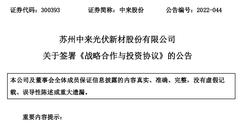 3月15日,蘇州中來光伏新材股份有限公司發布公告,公司擬在山西省古交市投資年產20萬噸工業硅及年產10萬噸高純多晶硅項目,項目擬分兩期建設,第一期擬投建年產20萬噸工業硅、年產1萬噸高純多晶硅項目,第二期擬投建年產9萬噸多晶硅項目,總投資期限預計5年,投資總金額約為人民幣140億元,其中一期項目投資金額約為43億元(年產20萬噸工業硅預計投資額約32億元、年產1萬噸高純多晶硅預計投資額約11億元)。