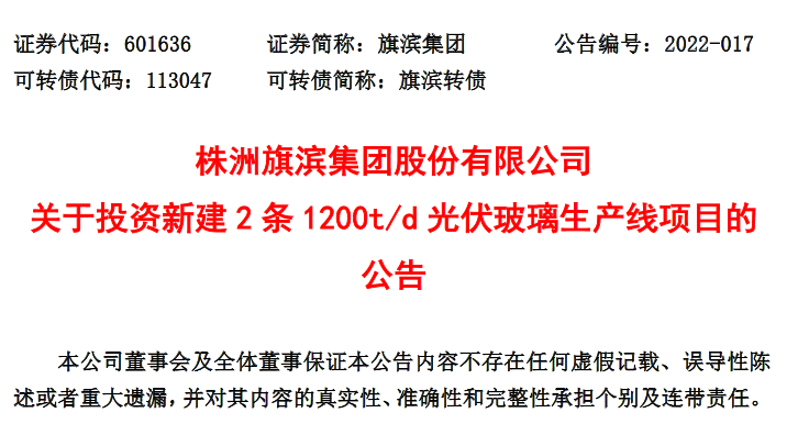 3月17日,株洲旗濱集團股份有限公司發布公告,公司全資子公司郴州旗濱光伏光電玻璃有限公司擬在馬來西亞沙巴州投資新建2條1200t/d光伏玻璃生產線,項目計劃總投資約312,000萬元人民幣。