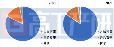 2020-2021年中國負極材料細分產(chǎn)品結(jié)構(gòu)(%)