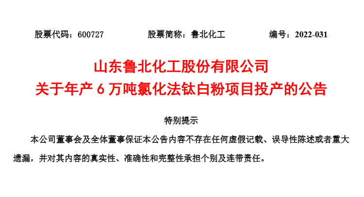 中國粉體網(wǎng)訊 4月12日,魯北化工發(fā)布公告稱,其全資子公司山東祥海鈦資源科技有限公司投資建設的年產(chǎn)6萬噸氯化法鈦白粉項目已完成主體建設及設備安裝、調(diào)試工作,項目已于2021年12月進入試車階段,目前該項目已正式投產(chǎn)。