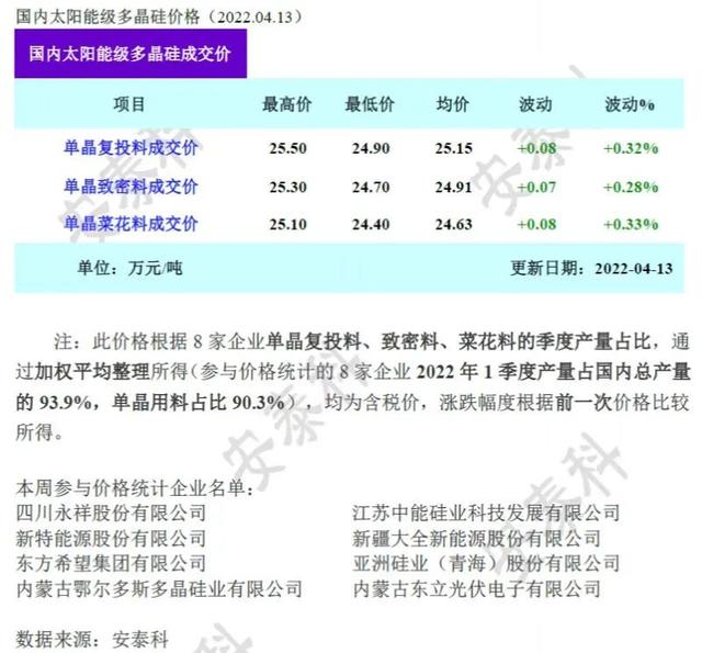 據(jù)硅業(yè)分會數(shù)據(jù)顯示,本周國內(nèi)多晶硅價格延續(xù)小幅上漲,其中單晶復(fù)投料、單晶致密料、單晶菜花料成交均價漲幅在0.3%左右。本周硅料成交相對清淡,主要由于絕大多數(shù)企業(yè)在月初已將4月份訂單全量簽訂完畢,近期以執(zhí)行前期訂單為主,只有個別企業(yè)簽訂少量4月份散單和5月份訂單。