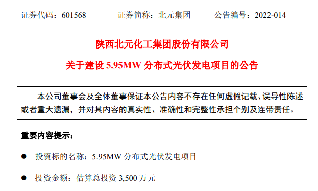 結合當前國家及地方相關政策,北元集團計劃投資建設 5.95MW 分布式光伏發電項目,在廠前區、化工、熱電和水泥區域裝置的部分屋面及部分地面空地建設分布式光伏發電站,推動實現“碳達峰”“碳中和”目標。投資金額預估為3500 萬元。