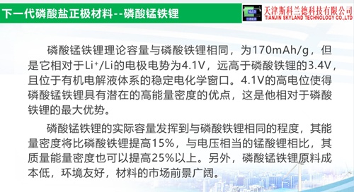憑成本低廉、安全性強等優勢,磷酸鐵鋰電池實現“逆襲”。從去年到現在,磷酸鐵鋰電池產量、年累計產量、裝車量超三元電池,一路遙遙領先。隨著技術演進,磷酸鐵鋰電池的能量密度能否突破“天花板”?磷酸錳鐵鋰作為磷酸鐵鋰電池技術的“升級版”,引發廣泛關注。來自天津斯科蘭德科技有限公司的李積剛總經理給予磷酸錳鐵鋰極高的評價,行業預測三年后磷酸錳鐵鋰電必將成為正極材料的主流!磷酸錳鐵鋰材料是一款連接3V磷酸鐵鋰材料和4V三元材料的有力橋梁,實現高安全、長壽命、能量密度超過磷酸鐵鋰材料20%以上,是磷酸鐵鋰的升級產品,也是替代部分三元材料無鈷高安全材料的首選。以下是部分精彩內容。