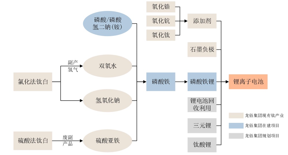 隨著新能源技術的推廣,鋰電池應用市場快速增長,為抓住市場機會,同時提高公司廢副產品的增加值,龍佰集團秉持“大化工、低成本”的發展思路,利用公司的管理、研發、技術及供應鏈優勢,研發生產磷酸鐵、磷酸鐵鋰、石墨負極等電池材料,培育第二增長曲線。