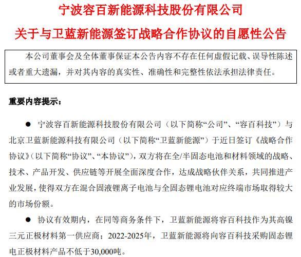 中國粉體網訊 4月26日晚間,容百科技公告,公司與衛藍新能源于近日簽訂《戰略合作協議》,雙方將在全/半固態電池和材料領域的戰略、技術、產品開發、供應鏈等開展全面深度合作。協議有效期內,在同等商務條件下,衛藍新能源將容百科技作為其高鎳三元正極材料第一供應商,2022~2025年采購固態鋰電正極材料產品不低于30000噸。