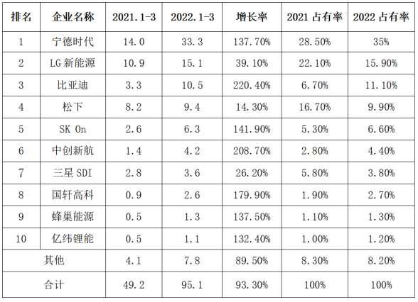 2022年一季度國內(nèi)動力電池裝機量TOP10統(tǒng)計表