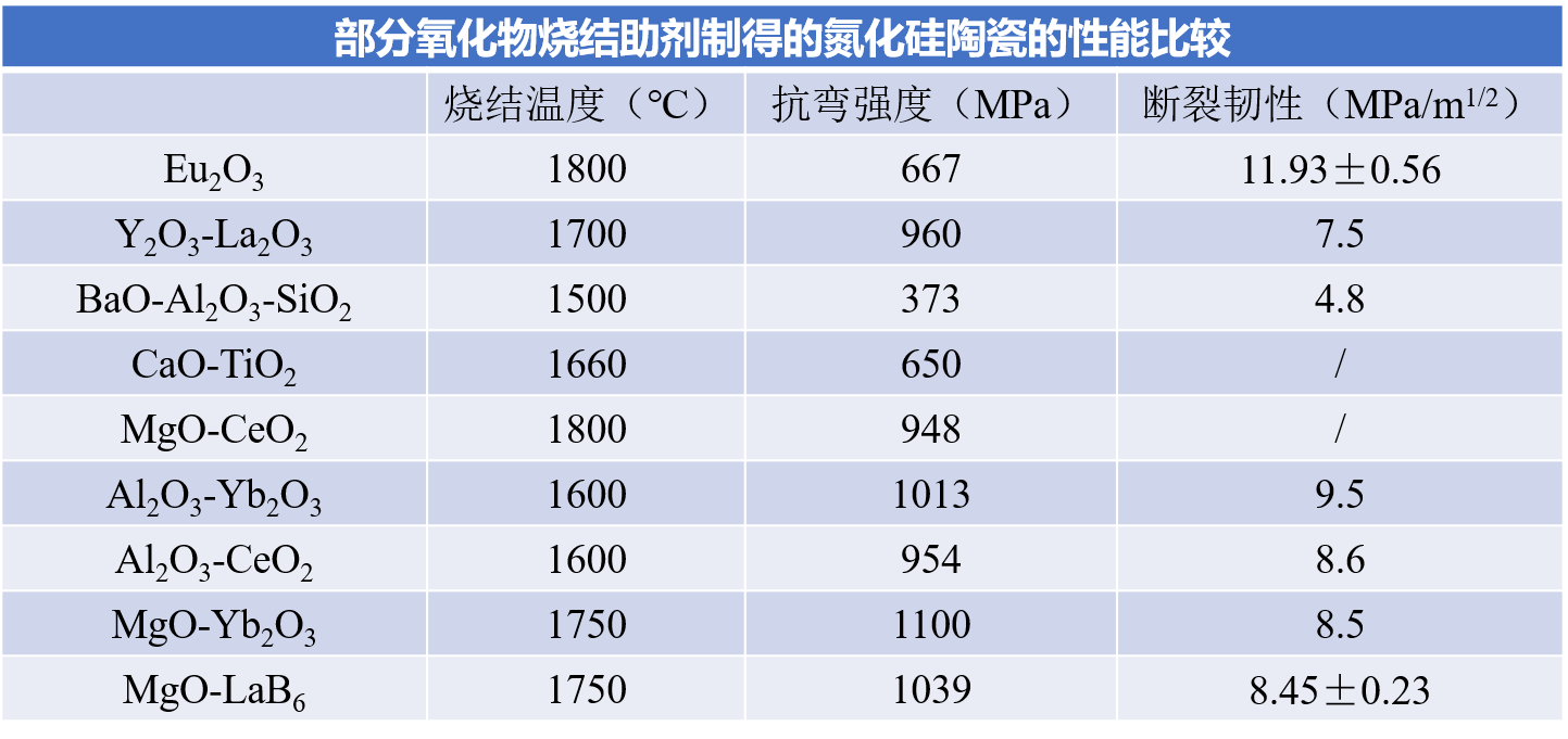 部分氧化物燒結助劑制得的氮化硅陶瓷的性能比較(數據來源:文科林等,《燒結助劑及增強相對氮化硅陶瓷材料性能的影響》)
