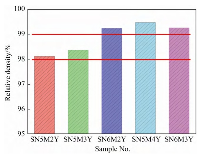 結果表明:當燒結助劑添加量為5%MgO+4%Y2O3時,樣品相對密度最高達到99.47%,即Si3N4陶瓷均已實現致密化。