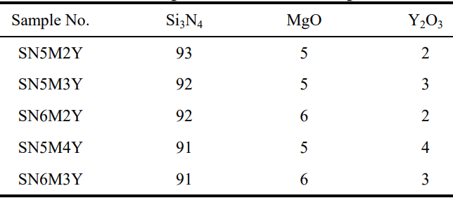 此外,燒結助劑的添加量對氮化硅的燒結密度也會產生一定影響。劉劍等以MgO、Y2O3為燒結助劑,按配方設計將Si3N4、MgO、Y2O3以一定摩爾比例混合(見下圖),成形后將陶瓷素坯放置在氮化硼坩堝中進行氣壓燒結,燒結溫度為1890℃,保溫2h。整個燒結過程中使用氮氣氣氛保護,壓力為2MPa。
