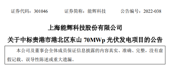 中國粉體網(wǎng)訊  2022 年 5 月 6 日,上海能輝科技股份有限公司(以下簡稱“能輝科技”)收到貴港市港北區(qū)東山 70MWp 光伏發(fā)電項(xiàng)目工程總承包中標(biāo)通知書,公司被確定為該項(xiàng)目的中標(biāo)單位。
