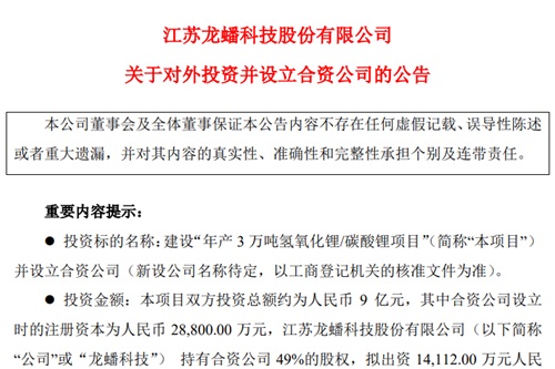 5月10日晚間,龍蟠科技發布對外投資公告,公司擬與唐山鑫豐鋰業有限公司(以下簡稱鑫豐鋰業)共同投資9億元在湖北省或河北省唐山市投資開發建設年產3萬噸氫氧化鋰/碳酸鋰項目,并擬由雙方組建的合資公司實施本項目,合資公司設立時的注冊資本為2.88億元,公司出資1.41億元,持有合資公司49%的股權。