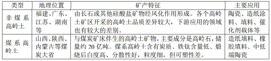 我國高嶺土主要可分成煤系高嶺土和非煤系高嶺土,主要區別、地理位置、礦產特征與主要應用列示如下: