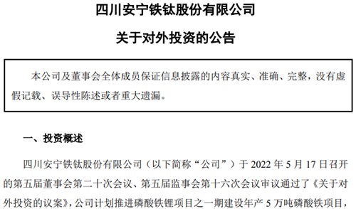 中國粉體網訊 5月17日晚間,安寧股份公告,公司董事會審議通過議案,計劃推進磷酸鐵鋰項目之一期建設年產5萬噸磷酸鐵項目,預計投資5億元。