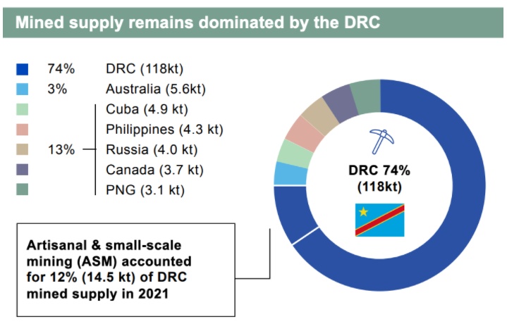 鈷的供應主要來自剛果民主共和國,在那里,鈷的生產主要由礦物和大宗商品貿易商嘉能可以及中國公司主導。